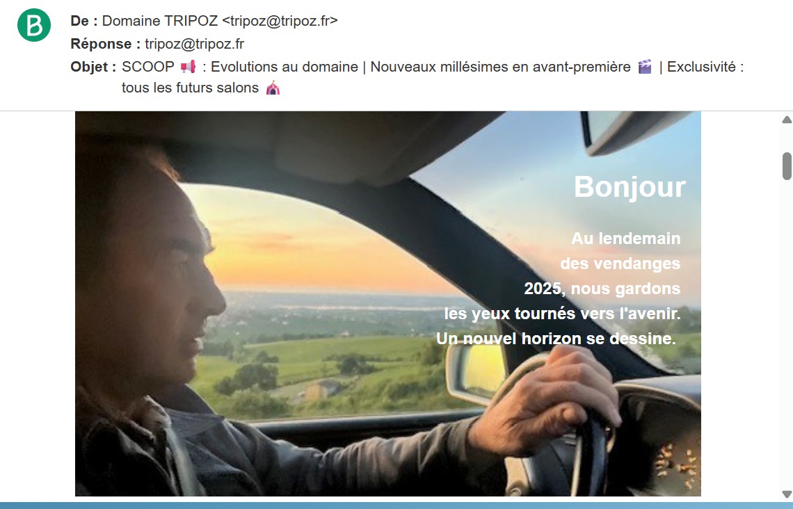 Newsletter de septembre 2025 10 septembre 2025 Le domaine SCOOP 📢 : Evolutions au domaine | Nouveaux millésimes en avant-première 🎬 | Exclusivité : tous les futurs salons 🎪